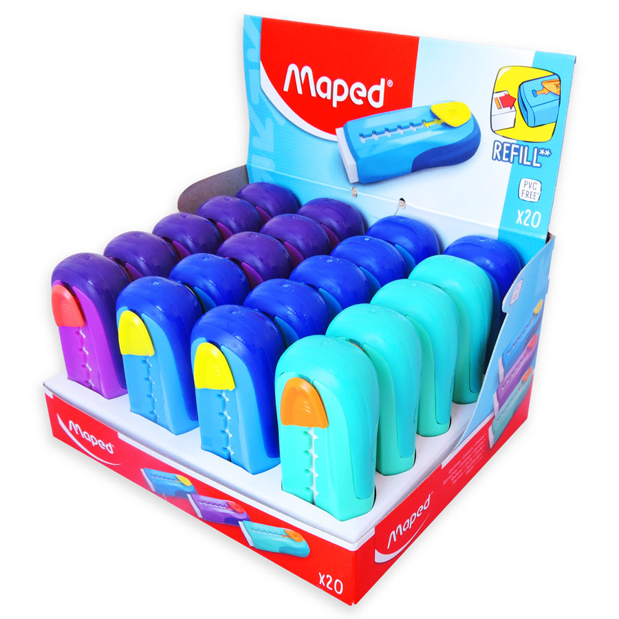 Innovación con el sello de Maped que permite utilizar la goma de forma uniforme, protegiéndola también de la suciedad. Recargable con goma de formato estándar (Maped Technic 600).