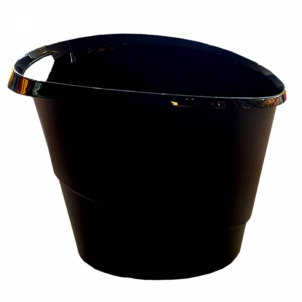 Papelera de color negro fabricada con plástico 100% reciclado. Tiene un asa para su fácil manipulación y una capacidad para 18 litros.