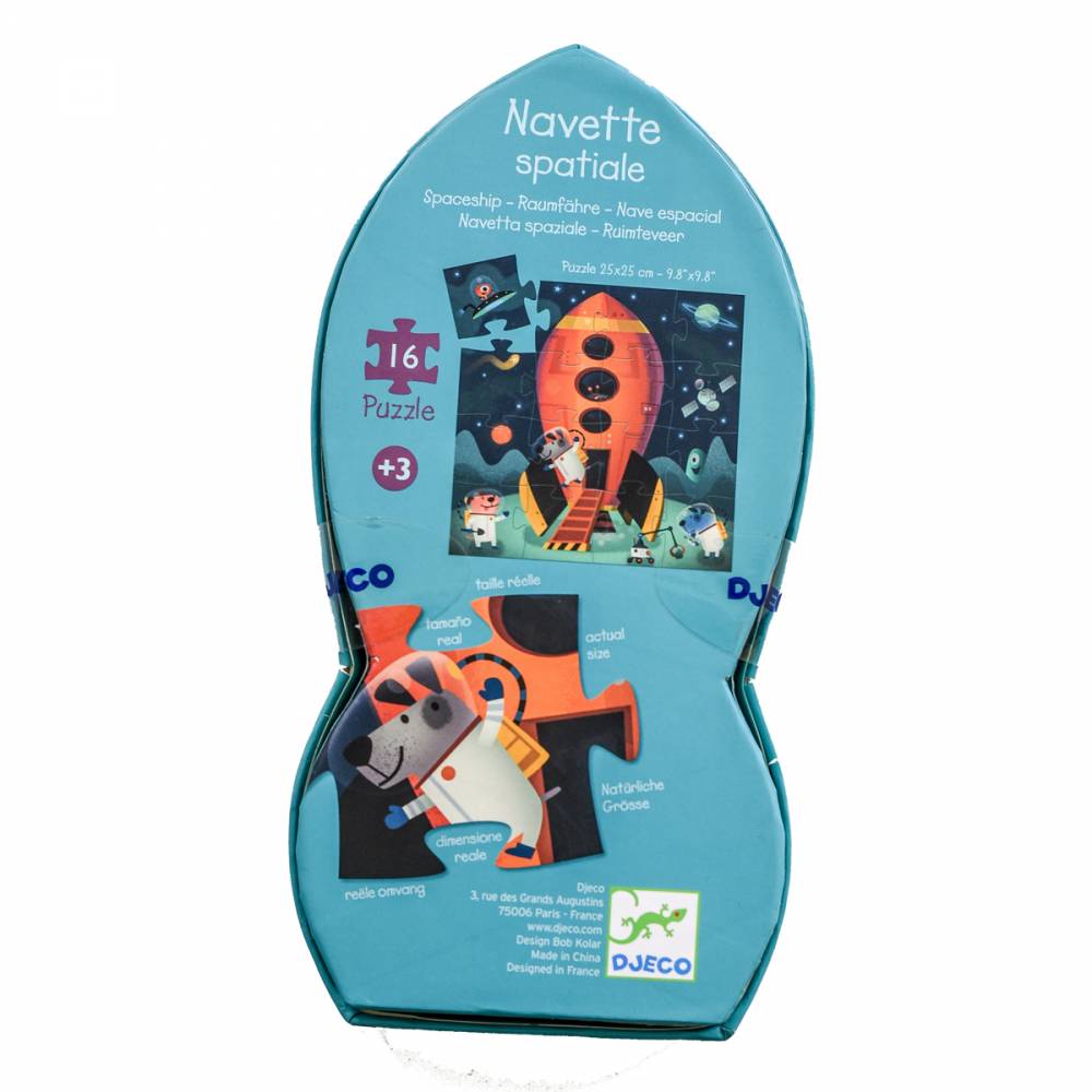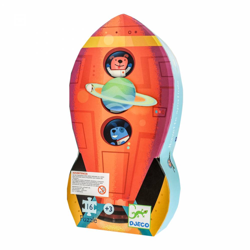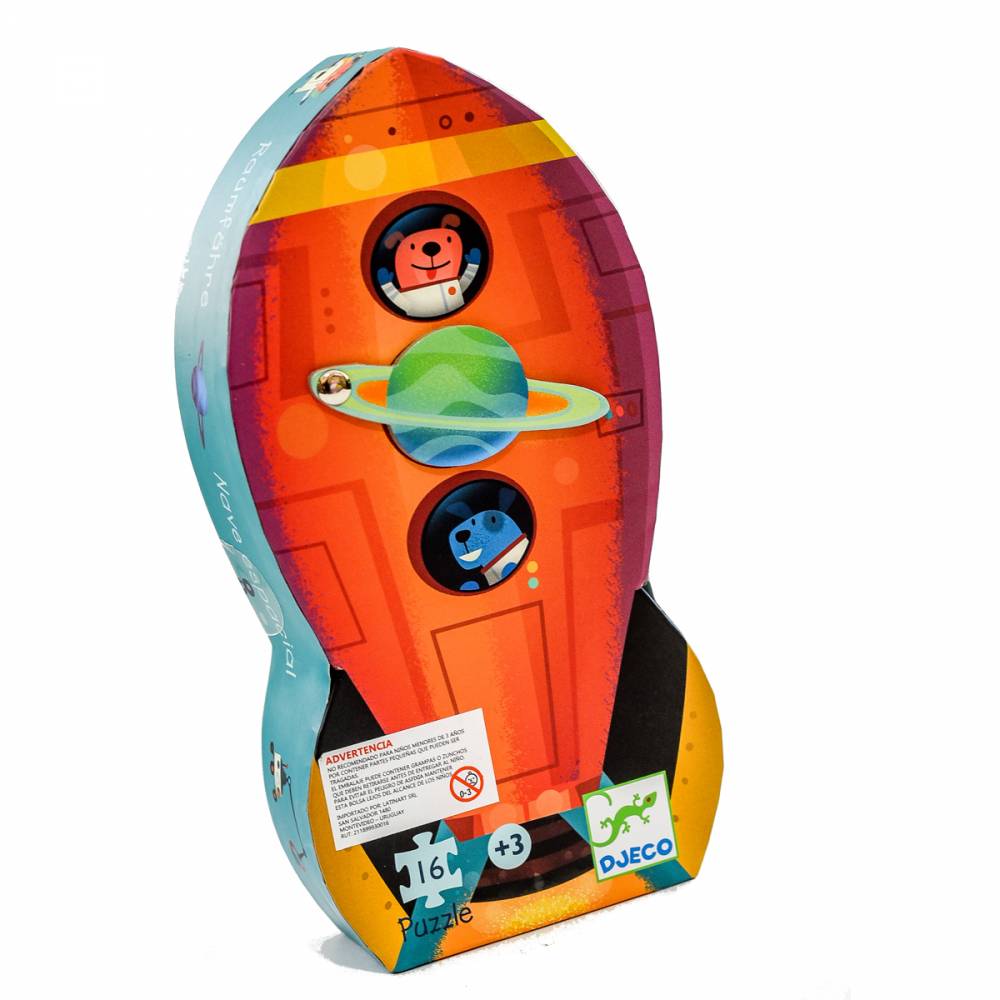 Puzzle de 16 piezas, presentado en una caja con forma de cohete, hernosa de coaracion en el dormitorio de un niño. Ideales para niños mayores de 3 años